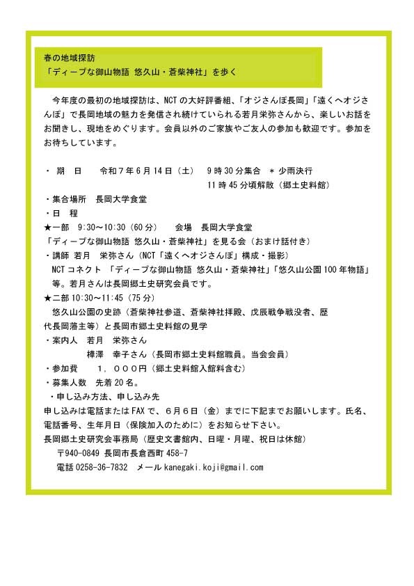 長岡郷土史研究会の後援イベントです。申し込み方法(7月4日まで)など、詳細はチラシをご覧ください。