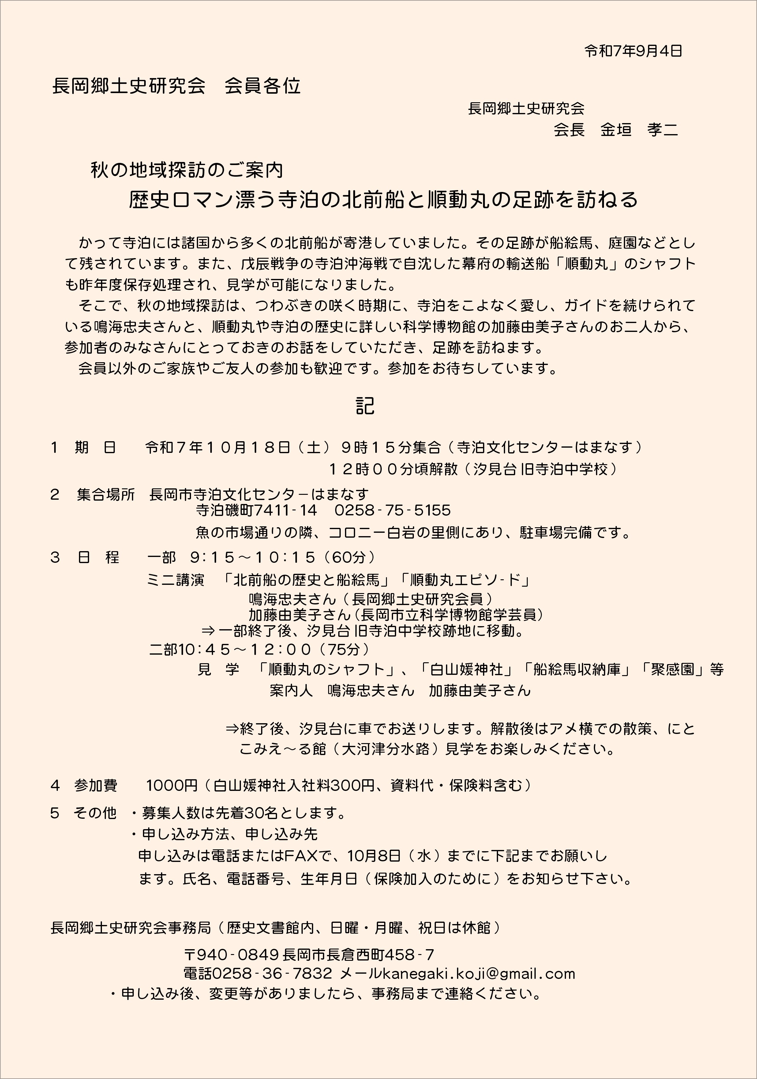 ・5月24日開催の長岡郷土史研究会「春の講演会」は定員に達しましたので、申込受付を締め切りました。