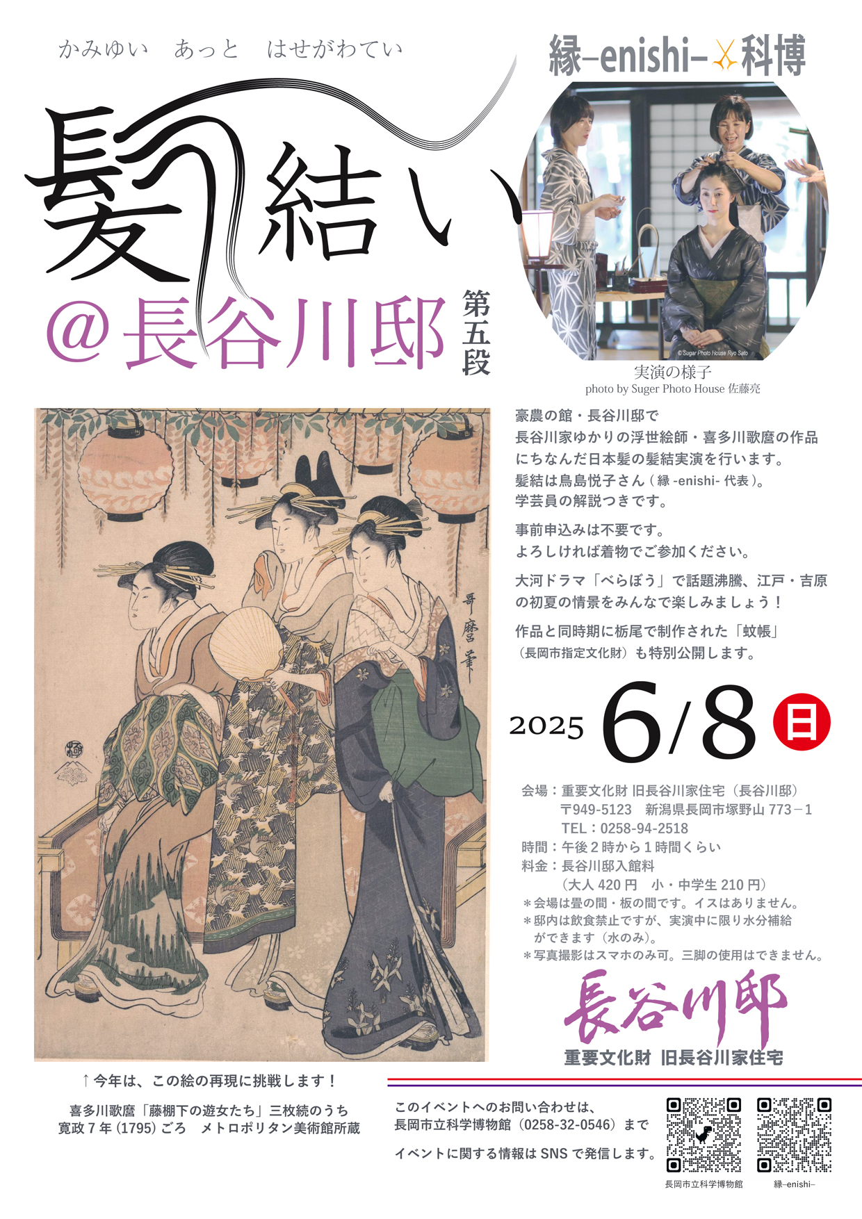 今年も恒例となった、長谷川家ゆかりの喜多川歌麿の作品にちなんだ日本髪の髪結実演を行います。