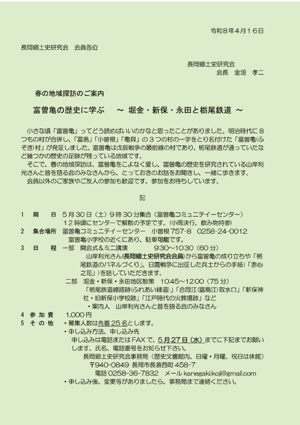 ・5月24日開催の長岡郷土史研究会「春の講演会」は定員に達しましたので、申込受付を締め切りました。