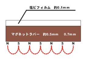 当社在庫品はベースマグネットラバー部分が0.7mm厚の2種類で、0.1mmの塩ビフィルムを貼ることで、0.8mmとしています。